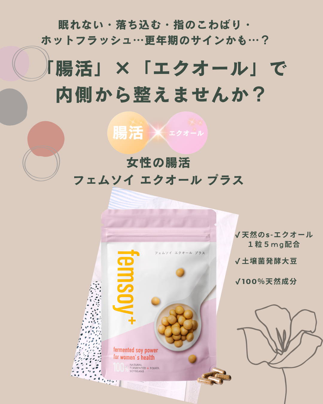 納豆や味噌など、食品で大豆をお召し上がりになるのは問題ございません。大豆イソフラボンのサプリメントの場合は、食品安全委員会で定められている、1日の摂取目安量の上限30mg(大豆イソフラボンアグリコン量)を目安にご利用ください。フェムソイ エクオール プラスの大豆イソフラボン量は、1カプセル6mgとなります。