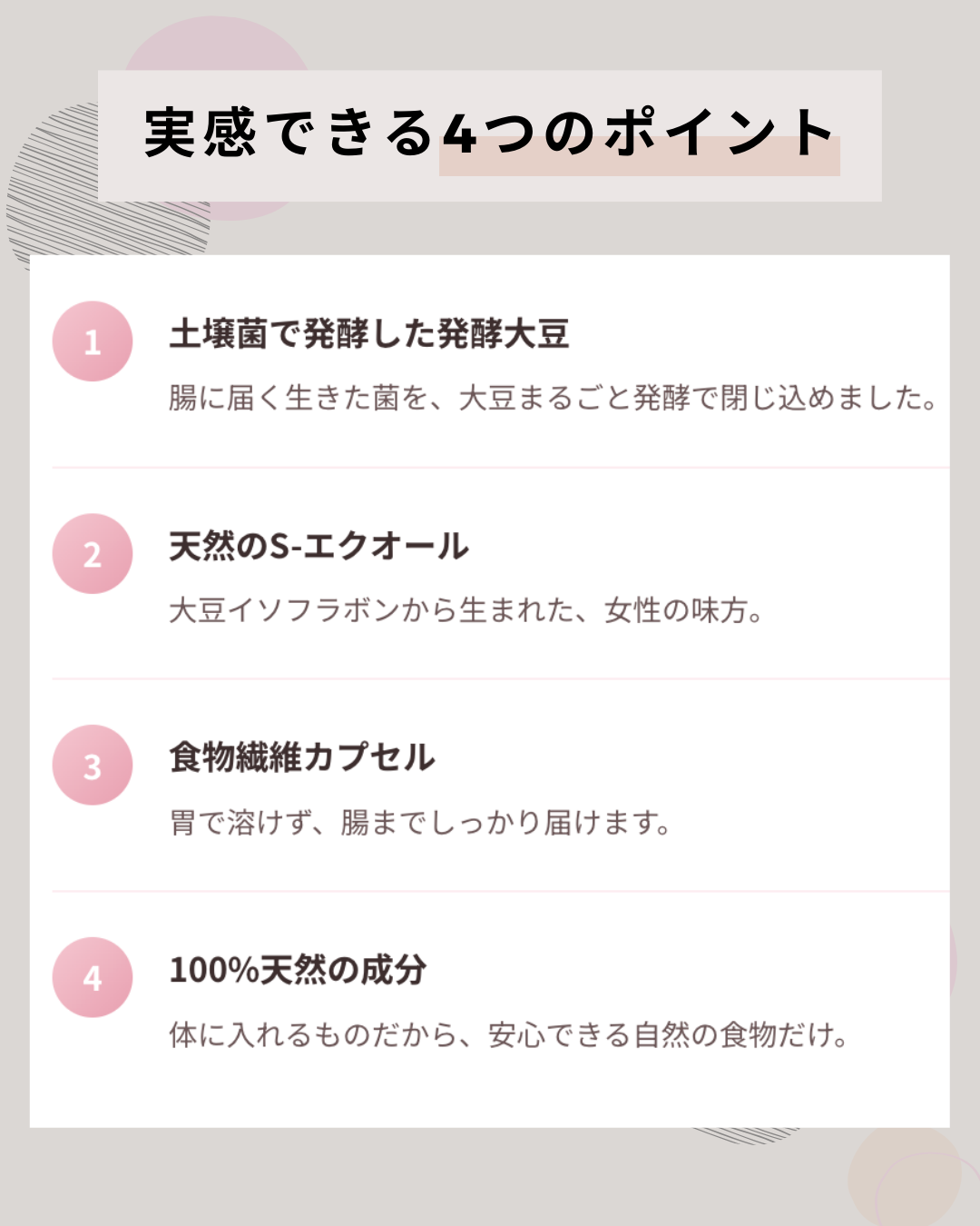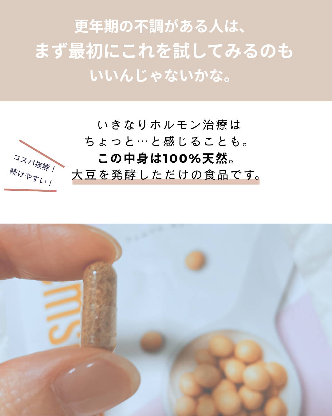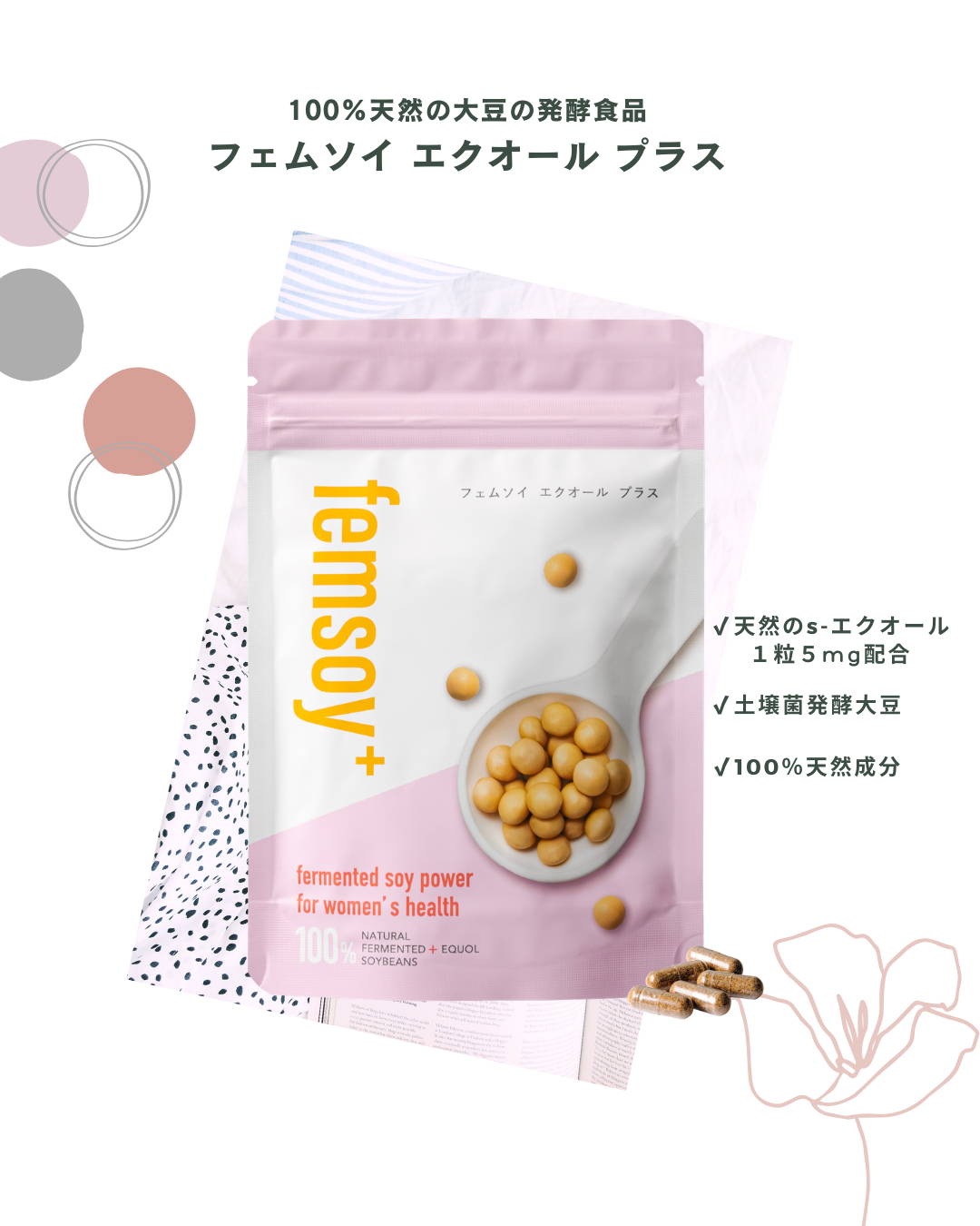 納豆や味噌など、食品で大豆をお召し上がりになるのは問題ございません。大豆イソフラボンのサプリメントの場合は、食品安全委員会で定められている、1日の摂取目安量の上限30mg(大豆イソフラボンアグリコン量)を目安にご利用ください。フェムソイ エクオール プラスの大豆イソフラボン量は、1カプセル6mgとなります。
